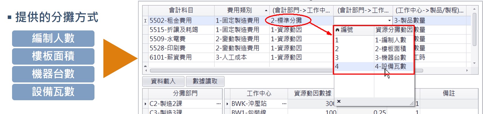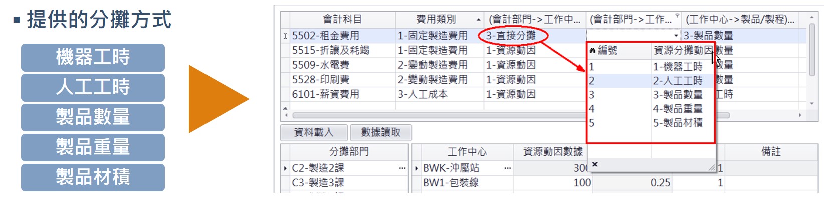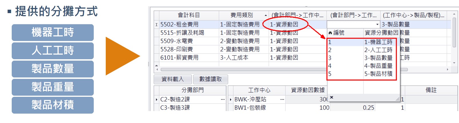 例如:電費,若是因為製品投產的機器工時越長,成本越大,這時候分攤的方式就可以選擇資源動因中的機器工時。