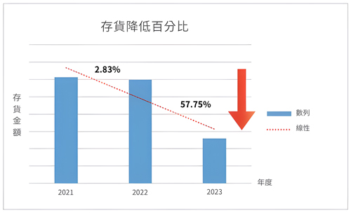 | 庫存降低 | 數位轉型後在營業額幾乎持平的情況下,相較系統導入前,i-TEC ERP導入後的庫存量成功降低了約 50%。![]() |
